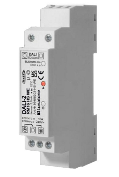 DALI RM16 HS stellt einen über den DALI-Bus steuerbaren Relaiskontakt zur Verfügung, Lasten ohne DALI-Eingang können damit einfach in einen DALI-Kreis eingebunden werden, Dauerlasten bis 2kW können über DALI-Befehle ein- und ausgeschaltet werden, durch gezieltes Schalten im Spannungs-Nulldurchgang wird der Schaltkontakt geschont und eine lange Lebensdauer erreicht, welchen Schaltzustand das Relais bei Power-Up und Busausfall annimmt kann über die DALI Cockpit PC Software voreingestellt werden, 1 Wechsler, DALI-2 zertifiziert, Hutschienenmontage
