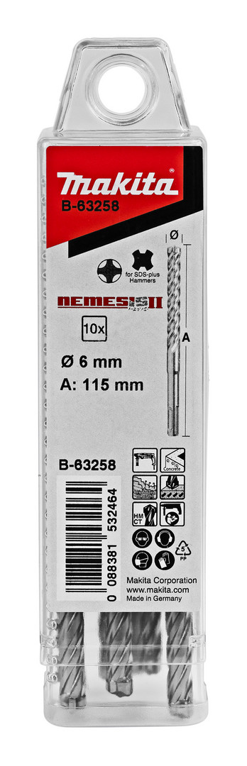 Vierschneidiger Bohrer NEMESIS II Ø 6,0 mm mit einer Gesamtlänge von 115 mm und SDS-PLUS-Aufnahme • 10 Stück