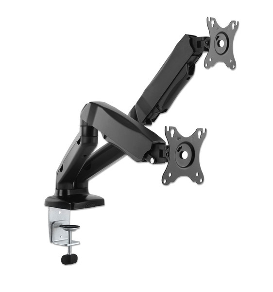 Frei bewegliche Arme mit jeweils zwei Gelenken für zwei LED/LCD-Monitore von 17" bis 32" und bis zu 9 kg pro Arm +90 bis -45° neigbar, 180° schwenkbar und 158 bis 406 mm höhenverstellbar für optimalen Blickwinkel Gasdruckfeder für Blickwinkelanpassung mit einer einfachen Berührung 360° rotierbar für Displayausrichtung im Hoch- oder Querformat Montageoptionen: C-Klemme für Tischkante (Oberflächenstärke 10 bis 83 mm) oder Klammer für Durchlass/Lochbohrung (Lochdurchmesser 10 bis 83 mm) Integrierte Spannungsanpassung für das individuelle Gewicht Ihres Monitors Robuste Aluminium-Konstruktion Integrierte Kabelführung minimiert Kabelgewirr Ideal für Anwendungen in Homeoffice, Büro, Studio, IT-Netzwerk oder Security Einfache und schnelle Installation; Montagematerial im Lieferumfang Entspricht VESA-Standards: 75x75, 100x100 3 Jahre Garantie