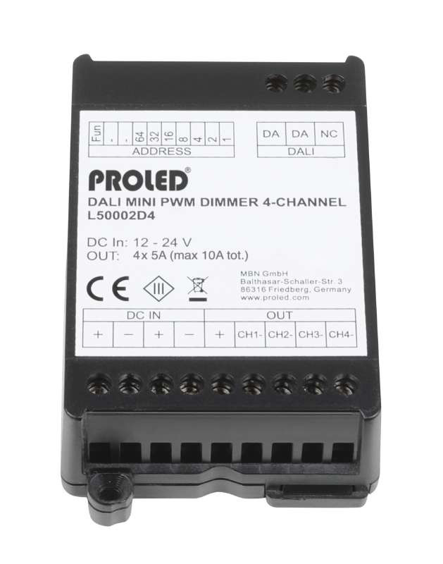 | Kurzbeschreibung | PROLED DALI MINI PWM DIMMER 4-CH; 12 - 24 VDC; 4x 10 A; 120 - 240 W; DALI |