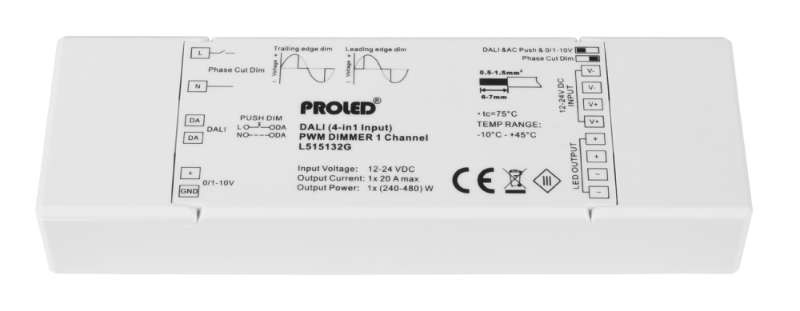 Kurzbeschreibung PROLED DALI 4-in-1 PWM Dimmer 1-Kanal 2G 12-48VDC 1x 20A (48VDC: 1x 10A) 240-480W DALI SIGNAL 1-10V PushDim TRIAC 100 kOhm Potentiometer