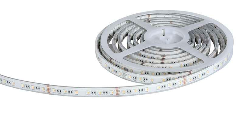 Die PROLED FLEX STRIPS sind perfekt zur indirekten Beleuchtung, für Sonderanfertigungen im Messe- oder Ladenbau und für jegliche Art der Beleuchtung geeignet. Durch ihre niedrige Baugröße und der individuell anpassbaren Länge bieten die PROLED FLEX STRIPS ein weites Spektrum an Einsatzmöglichkeiten. - RGBW (4 Farben in einer LED). Dadurch Pastellfarbtöne und echtes Weiß möglich. - Hohe Flexibilität - anpassbar an runde Formen. - Befestigung mit Clips oder Spezialkleber. Das 3M Klebeband auf der Strip Rückseite (selbstklebend) dient nur als Montagehilfe. - IP68 für unter Wasser Einsatz (Anschlusskabel/Endkappen IP65 bei korrektem Verkleben) - dimmbar und ansteuerbar mit geeigneten PWM Dimmern