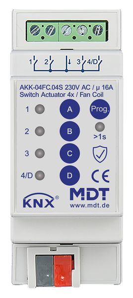 | Kurzbeschreibung | KNX Schaltaktor 4-fach, 2TE REG, 16 A, 230 V AC, Kompakt, 70µF, Fan coil, Secure |