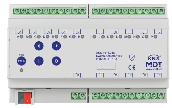 KNX Schaltaktor 16-fach, 8TE REG, 16 A, 230 V AC, Kompakt, 70µF, 10 EVG, Secure. Kompakte Ausführung mit bistabilen Relais. Strom max. 16 A bei ohmscher Last, 70 µF / 10 EVG. KNX Data Secure. Funktionserweiterung. Handbedienung sperrbar und LED Anzeige je Kanal. Virtuelles Interface in der ETS. Bis zu 6 Zentralobjekte mit Statusobjekten. Status Rückmeldung für alle Kanäle (auch bei manueller Betätigung). Zeitfunktionen (Ein-/Ausschaltverzögerung). Umfangreiche Treppenlicht- und Impulsfunktion. Logische Verknüpfungen. 4 mm² Anschlussklemmen. Alle L-Anschlüsse getrennt. Erweiterte Szenenfunktion je Kanal. Zentralfunktionen und Sperrobjekte zur Zwangsführung. Einstellbares Verhalten bei Busspannungsausfall/-wiederkehr. Versorgungsspannung über KNX-Bus. Schließer- und Öffnerbetrieb. 3 Jahre Produktgarantie.