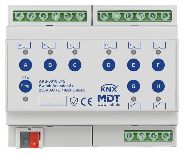 KNX Schaltaktor 8-fach, 6TE REG, 10 A, 230 V AC, C-Last,Standard,140µF, Secure. Standardausführung mit bistabilen Relais Strom max. 10 A, kapazitive Last max. 140 µF. KNX Data Secure. Platzsparend durch optimalen Formfaktor. 4 mm² Anschlussklemmen. Alle L-Anschlüsse getrennt. Virtuelles Interface in der ETS. Bis zu 6 Zentralobjekte mit Statusobjekten. Handbedienung sperrbar und LED Anzeige je Kanal. Status Rückmeldung für alle Kanäle (auch bei manueller Betätigung). Zeitfunktionen (Ein-/Ausschaltverzögerung, Treppenlichtfunktion). Erweiterte Logik und Szenenfunktion je Kanal. Erweiterte Statusfunktionen (invertiert, zyklisch, bei Sperre). Schwellwertschalter (1 Byte/2 Byte/2 Byte float). Betriebsstundenzähler. Priorität/Zwangsführung mit automatischer Rückfallzeit. Versorgungsspannung über KNX-Bus. Schließer- und Öffnerbetrieb. Umfangreiche Applikation. 3 Jahre Produktgarantie.