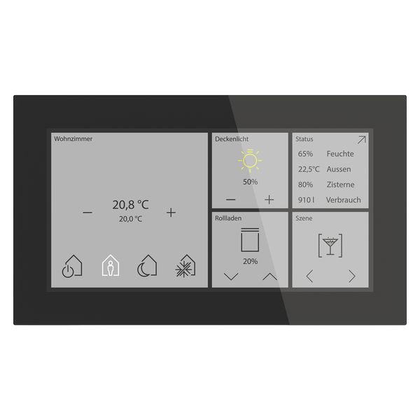 KNX Glas Touch Smart 6 Zoll, KNX Data Secure, Schwarz. Ausführung mit 6 Zoll Farbdisplay und umlaufendem weißen Orientierungslicht. Bis zu 64 Funktionen und bis zu 12 Statusanzeigen im Standby. Multifunktionstaster mit kapazitivem, hochauflösendem 6 Zoll TFT-Farbdisplay (1440 x 720 Pixel). Hochwertiges Design aus Glas und gebürstetem Aluminium. Intuitive Bedienoberfläche zur einfachen Steuerung der Raumfunktionen. Umlaufendes weißes Orientierungslicht. Bis zu 64 Funktionen auf individuellen Ebenen und bis zu 12 Statusanzeigen im Standby. Raumfunktionen: Schalten, Dimmen, Tunable White, HSV, RGB, RGBW, Sonnenschutz, HVAC. Sprungfunktion für schnellen Seitenwechsel. Komfortabler Raumtemperaturregler mit Temperatursensor für Heiz- und Kühlbetrieb. Logikfunktionen, Szenensteuerung, Innovative Gruppensteuerung. Anzeige von Statusinformationen (1 Bit) und Meldungen (14 Byte). Schutz vor unberechtigtem Zugriff durch Codeschloss-Funktion (1 Nutzer). Individuelle Gestaltung nach Kundenwunsch (Logo, Hintergrundbild, Designfarben). Mit Diebstahl-/Demontageschutz. Einbau in eine handelsübliche Schalterdose (EU, UK, CH, CN). Integrierter Busankoppler, KNX Data Secure. Installation: Horizontal oder vertikal. Abmessungen (H x B x T): 92 x 160 x 12,5 mm.