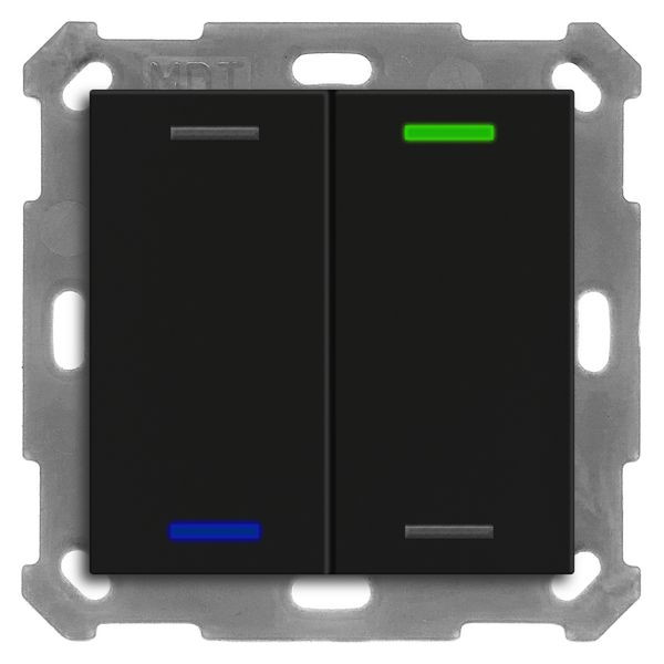KNX Taster Light 55 2-fach, RGBW, Schwarz matt, Neutral. Ausführung Neutral mit 2 Tastenpaaren / 4 Tasterflächen. Passend für 55 mm Schalterprogramme z. B. MDT Sortiment 55 oder GIRA Standard 55, E2, Event, Esprit oder BERKER S1, B3, B7 oder JUNG A 500, A PLUS, A CREATION, AS 500, A 550, A FLOW oder MERTEN 1M, M-Smart, M-Plan, M-Pure. Die Tasten sind als Tastenpaar oder Einzeltasten frei einstellbar. Ein- und Zweitasterbetrieb für Schalten, Dimmen, Jalousie, Werte. Umschalten von bis zu vier Werten oder Szenen. Kurzer/Langer Tastendruck mit 2 Objekten. Innovative Gruppensteuerung mit langem/extra langem Tastendruck. Mehrfach-Tippfunktion sendet bis zu 4 Werte auf gleiche oder verschiedene Objekte. Zwei RGBW Status-LEDs pro Tastenpaar. LED Helligkeit über Tag/Nacht- oder Helligkeit-Objekt steuerbar. 4 Logikblöcke. Einbau in Schalterdose mit mitgeliefertem Tragring. Integrierter Busankoppler. 3 Jahre Produktgarantie.