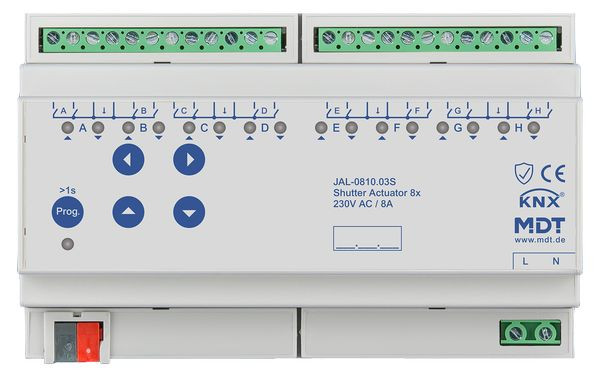 KNX Jalousieaktor 8-fach, 8TE REG, 8 A, 230 V AC, Secure. Für 230 V AC Motoren bis 300 W. Mit Sonnenstandsberechnung. KNX Data Secure. Mit Sonnenstandsberechnung. Virtuelles Interface in der ETS. Zentralobjekte mit optionaler Verzögerung. Umfangreiche Applikation. Handbedienung sperrbar und LED Anzeige je Kanal. Betriebsart für Jalousie/Rollladen. Praxisnahe Lüftungsfunktion (Fenster geöffnet/gekippt). Automatische Beschattung/Lamellennachführung mit Sonnenstandsberechnung. Betriebsstundenzähler. Lauf-, Pausen- und Schrittzeit frei einstellbar. Separat einstellbare Verfahrzeiten für Auf/Ab. Tastbetrieb zur genauen Positionierung. Erweiterte 1 Bit Automatikpositionen und Szenenfunktionen. 1 Byte absolute Positionierung für Höhe und Lamelle. Alarm-, Zentral- und Sperrfunktionen. Verhalten nach Alarm und Sperre separat einstellbar. Einstellbares Verhalten bei Busspannungsausfall/-wiederkehr. Je zwei L-Anschlüsse intern gebrückt. 3 Jahre Produktgarantie.