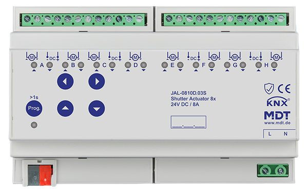 KNX Jalousieaktor 8-fach, 8TE REG, 8 A, 24 V DC, Secure. Für 24 V DC Motoren bis 180 W. Mit Sonnenstandsberechnung. KNX Data Secure. Mit Sonnenstandsberechnung. Virtuelles Interface in der ETS. Zentralobjekte mit optionaler Verzögerung. Handbedienung sperrbar und LED Anzeige je Kanal. Betriebsart für Jalousie/Rollladen. Praxisnahe Lüftungsfunktion (Fenster geöffnet/gekippt). Automatische Beschattung/Lamellennachführung mit Sonnenstandsberechnung. Betriebsstundenzähler. Lauf-, Pausen- und Schrittzeit frei einstellbar. Separat einstellbare Verfahrzeiten für Auf/Ab. Tastbetrieb zur genauen Positionierung. Erweiterte 1 Bit Automatikpositionen und Szenenfunktionen. 1 Byte absolute Positionierung für Höhe und Lamelle. Alarm-, Zentral- und Sperrfunktionen. Verhalten nach Alarm und Sperre separat einstellbar. Für 24 V DC Motoren mit 2 Anschlüssen. Integrierte Polwendeschaltung. Einstellbares Verhalten bei Busspannungsausfall/-wiederkehr. 3 Jahre Produktgarantie.