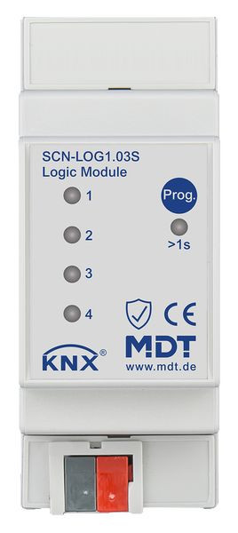 KNX Logikmodul, 2TE REG, Secure. Ausführung im Reiheneinbaugehäuse, mit 4 frei belegbaren LEDs. KNX Data Secure. 36 unabhängige Funktionsblöcke frei belegbar:. Universallogik mit bis zu 5 Bedingungen. Logikgatter (AND/OR/XOR) mit je 8 Eingängen. Funktion für "Deep Sleep" Geräte. Zyklisches Senden und Abfragen von Werten. Abfragen / Senden von Werten nach Busspannungswiederkehr. Speichern von Werten bei Busspannungsausfall. Betriebsstundenerfassung über ein Objekt. Telegrammüberwachung, Telegrammvervielfacher/Sequenzer. Filterfunktionen. Multiplexer/Trennwandfunktion. Geräteüberwachung für 60 Geräte. Temperatur-/Wertevergleicher. Zeitfunktionen. Nachlaufsteuerung mit Lüftungsstufe. Min-/Max-/Mittelwert, Universalrechner, Formatwandler. Umwandlung in PWM. 4 LEDs für interne und externe Objekte. 3 Jahre Produktgarantie.
