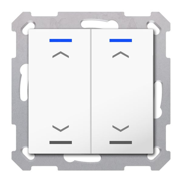 KNX Taster Light 55 2-fach, RGBW, Reinweiß glänzend, Jalousie, Secure. Ausführung Auf/Ab Symbol mit 2 Tastenpaaren / 4 Tasterflächen. KNX Data Secure, integrierter Busankoppler. Passend für 55 mm Schalterprogramme z. B. MDT Sortiment 55 oder GIRA Standard 55, E2, Event, Esprit oder BERKER S1, B3, B7 oder JUNG A 500, A PLUS, A CREATION, AS 500, A 550, A FLOW oder MERTEN 1M, M-Smart, M-Plan, M-Pure. Die Tasten sind als Tastenpaar oder Einzeltasten frei einstellbar. Intelligentes Ein-Tasten-Dimmen. Erweiterte Funktion "Werte senden". Ein- und Zweitasterbetrieb für Schalten, Dimmen, Jalousie, Werte. Umschalten von bis zu vier Werten oder Szenen. Kurzer/Langer Tastendruck mit 2 Objekten. Innovative Gruppensteuerung mit langem/extra langem Tastendruck. Mehrfach-Tippfunktion sendet bis zu 4 Werte auf gleiche oder verschiedene Objekte. Zwei RGBW Status-LEDs pro Tastenpaar. LED Helligkeit über Tag/Nacht- oder Helligkeit-Objekt steuerbar. 4 Logikblöcke. Einbau in Schalterdose mit mitgeliefertem Tragring. 3 Jahre Produktgarantie.