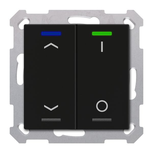 KNX Taster Light 55 2-fach, RGBW, Schwarz matt, Jalousie_Schalten, Secure. Ausführung Auf/Ab und I/O Symbol mit 2 Tastenpaaren / 4 Tasterflächen. KNX Data Secure, integrierter Busankoppler. Passend für 55 mm Schalterprogramme z. B. MDT Sortiment 55 oder GIRA Standard 55, E2, Event, Esprit oder BERKER S1, B3, B7 oder JUNG A 500, A PLUS, A CREATION, AS 500, A 550, A FLOW oder MERTEN 1M, M-Smart, M-Plan, M-Pure. Die Tasten sind als Tastenpaar oder Einzeltasten frei einstellbar. Intelligentes Ein-Tasten-Dimmen. Erweiterte Funktion "Werte senden". Ein- und Zweitasterbetrieb für Schalten, Dimmen, Jalousie, Werte. Umschalten von bis zu vier Werten oder Szenen. Kurzer/Langer Tastendruck mit 2 Objekten. Innovative Gruppensteuerung mit langem/extra langem Tastendruck. Mehrfach-Tippfunktion sendet bis zu 4 Werte auf gleiche oder verschiedene Objekte. Zwei RGBW Status-LEDs pro Tastenpaar. LED Helligkeit über Tag/Nacht- oder Helligkeit-Objekt steuerbar. 4 Logikblöcke. Einbau in Schalterdose mit mitgeliefertem Tragring. 3 Jahre Produktgarantie.