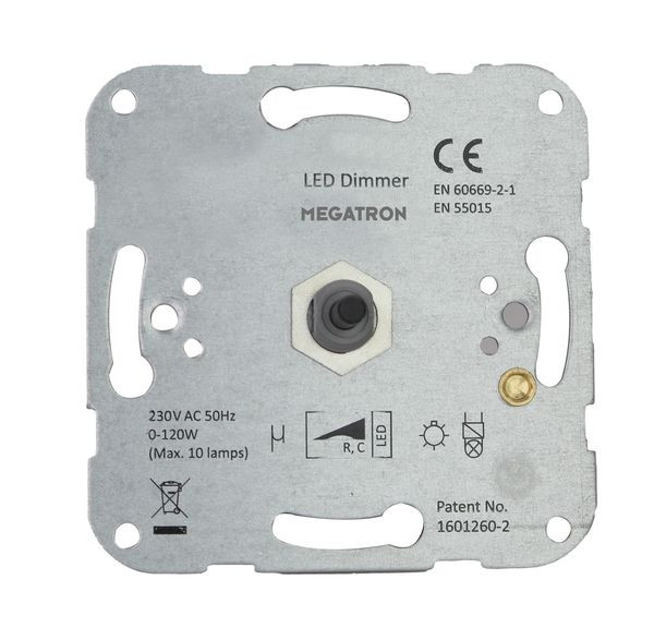 Universal-LED-Dimmereinsatz mit Drehschalter für LED-Lichtquellen ohne Abdeckung. Garantierte Kompatibilität mit allen LED-Lampen und LED-Leuchten von MEGAMAN, MEGAMAN und LIGHTME. Hervorragende Funktionalität auch mit den meisten LED-Lichtquellen anderer Fabrikate. Auch für Halogen- und Glühlampen geeignet. Lineares, ruckfreies und flackerfreies Dimmen von 100 Prozent Helligkeit bis an die unterste Dimmstufe der Lichtquelle. Die Grundplatte des Dimmers verfügt über die üblichen Maße und Bohrungen, um mit Abdeckungen der gängisten Schalterserien kombiniert zu werden (keine Kompatibilitätsgarantie).