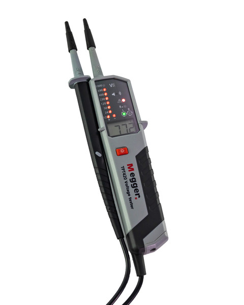 Der Megger TPT420 Spannungsprüfer wurde entwickelt, um Elektrikern und Elektroingenieuren einen einfach zu bedienenden Spannungsprüfer an die Hand zu geben, das auch dann noch funktioniert, wenn die Batterie erschöpft ist. Der TPT420 ist überaus vielseitig - er ist sowohl mit LCD- als auch mit LED-Anzeigen ausgestattet und bietet sowohl AC- als auch DC-Spannungsmessungen von 12 bis 1000 V AC und bis zu 1500 V DC. Darüber hinaus ist eine Durchgangsfunktion im Bereich von 0 bis 500 kO enthalten. Ein akustisches Signal bietet bei Durchgangs- und Spannungsmessungen für zusätzliche Sicherheit.