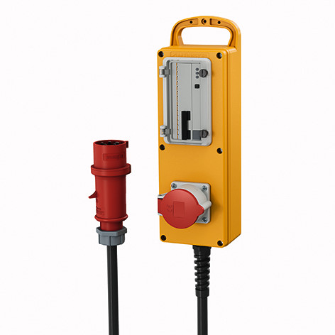 MENNEKES Leiste EverGUM tragbar anschlussfertig verdrahtet Schutzart IP 44 PRCD-S Gehaeuse: 1 Vollgummi-Gehaeuse 370x135x95 mm(LxBxH) signalgelb RAL 1003, mit Traggriff Absicherung unter transparenter Betaetigungsklappe Bestueckung/Absicherung: 1 CEE-Steckdose 32A 5p 400V 1x ortsveraenderliche Fehlerstromschutzeinrichtung DPRCD-M1 40A 4p+PE IFN=0,03A - allstromsensitiv Typ B - (Doepke 09342100) Zuleitung/Anschlussmoeglichkeit: 1 M25 mit Knickschutzspirale 2m Zuleitung H07RN-F5G4 mit CEE-Stecker 32A 5p 400V Phasenwender