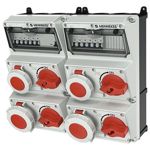 Leitungseinführung/Anschlussmöglichkeit: je 2 M 40 oben und unten (verschlossen) je 2 M 20 oben und unten (verschlossen) Klemme für2 Leitungen bis 5 x 25 mm² MENNEKES Steckdosen-Kombination AMAXX anschlussfertig verdrahtet Schutzart IP 67 Gehaeuse: 2 AMAPLAST-Gehaeuse 390x225 mm (HxB) plombierbar, mit Aussen- u. Innenbefestigung Unterteil schwarz Oberteil elektrograu RAL 7035 seitlich anscharniert mit Doppelgewinde-Deckelschrauben Absicherung auf vorziehbarer Tragschiene unter transparenter Betaetigungsklappe nach unten oeffnend und mittels Vorhaengeschloss abschliessbar Steckdosen mit generell schraeger Steckrichtung Bestueckung/Absicherung: Gehaeuse links Pos.01 1 CEE-Steckdose 16A 5p 400V abschaltbar, mit mechanischer DUO-Verriegelung 1 LS-Schalter 16A 3p C Pos.02 1 CEE-Steckdose 32A 5p 400V abschaltbar, mit mechanischer DUO-Verriegelung 1 LS-Schalter 32A 3p C Gehaeuse rechts Pos.03 1 CEE-Steckdose 16A 5p 400V abschaltbar, mit mechanischer DUO-Verriegelung 1 LS-Schalter 16A 3p C Pos.04 1 CEE-Steckdose 32A 5p 400V abschaltbar, mit mechanischer DUO-Verriegelung 1 LS-Schalter 32A 3p C Pos.01-04 1 FI-Schutzschalter 63A 4p IFN=0,03A Leitungseinfuehrung/Anschlussmoeglichkeit: je 2 M 40 oben und unten (verschlossen) je 2 M 20 oben und unten (verschlossen) Klemme fuer 2 Leitungen bis 5 x 25 mm²