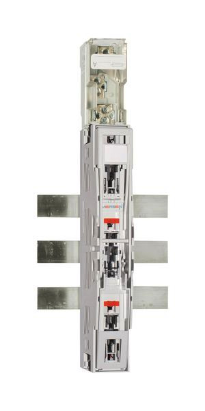Kurzbeschreibung Sicherungslastschaltleiste NH Größe 00 AC690V 160A 3-polig für ein 60 mm Sammelschienensystem mit Anschluss M8 und Schelle 4-70 mm² Abgang oben