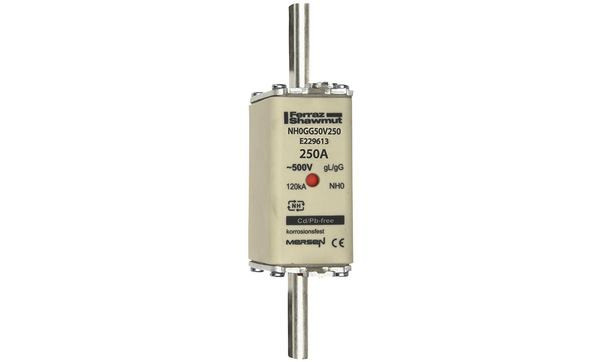 | Kurzbeschreibung | Sicherungseinsatz NH gG Gr.0 AC500V DC250V 250A mit spannungsführenden Grifflaschen sfü und Doppelkennmelder |