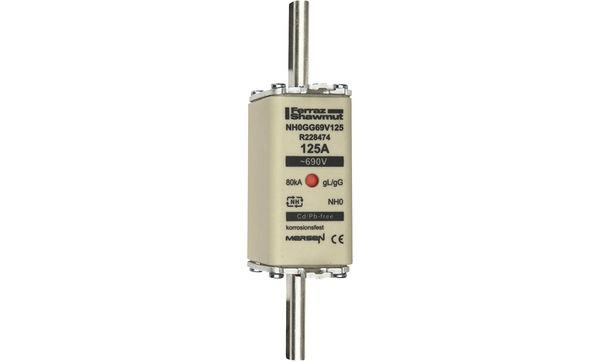 | Kurzbeschreibung | Sicherungseinsatz NH gG Gr.0 AC690V DC400V 125A mit spannungsführenden Grifflaschen sfü und Doppelkennmelder |