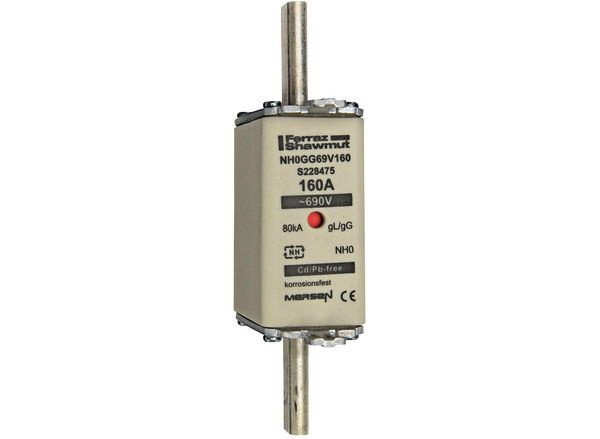 | Kurzbeschreibung | Sicherungseinsatz NH gG Gr.0 AC690V DC400V 160A mit spannungsführenden Grifflaschen sfü und Doppelkennmelder |