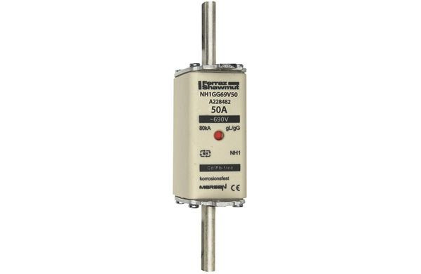 | Kurzbeschreibung | Sicherungseinsatz NH gG Gr.1 AC690V DC400V 50A mit spannungsführenden Grifflaschen sfü und Doppelkennmelder |