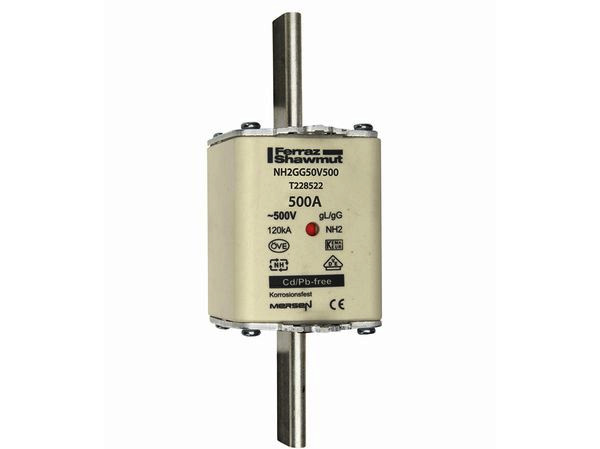 | Kurzbeschreibung | Sicherungseinsatz NH gG Gr.2 AC500V DC250V 500A mit spannungsführenden Grifflaschen sfü und Doppelkennmelder |