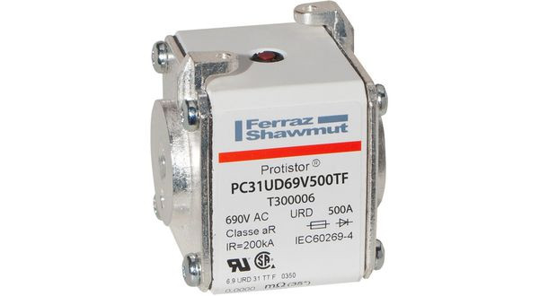 | Kurzbeschreibung | Sicherungseinsatz aR Größe 31 IEC AC690V UL AC700V 500A TTF mit Gewindeanschluss M8 und Schlagbolzen |