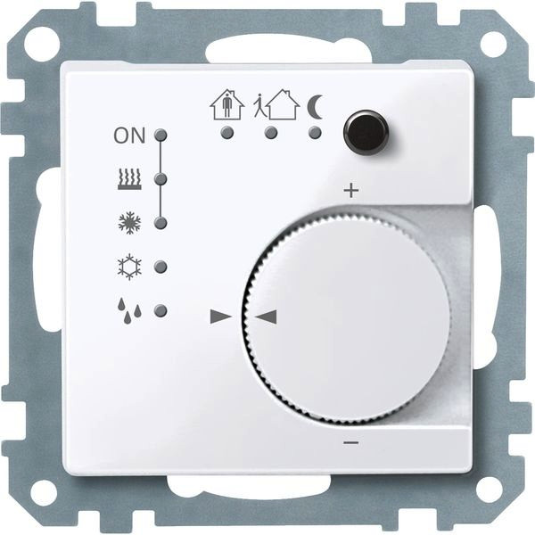 Im Design System M. Das Gerät ist ein Raumtemperaturregler und ein Binäreingang. In Abhängigkeit der Betriebsart, des aktuellen Temperatur-Sollwertes und der Raumtemperatur wird eine Stellgröße zur Heizungs- oder Kühlungssteuerung auf den KNX gesendet. Die Temperatur kann wahlweise durch den internen oder durch einen externen Temperaturfühler, der an der Klemmleiste der Tasterschnittstelle anzuschließen ist, erfasst. Die Tasterschnittstelle erzeugt intern eine Signalspannung zum Anschluss von max. vier konventionellen Tastern/potentialfreien Kontakten. Davon lassen sich zwei Eingänge zum Anschluss von Low Current-LEDs verwenden. Mit integriertem Busankoppler. Der Busanschluss erfolgt über eine Busanschlussklemme. Softwarefunktionen KNX Funktionen Raumtemperaturregler Reglertyp 2-Punkt-Regelung, stetige PI-Regelung, schaltende PI-Regelung (PWM). Ausgang Stetig im Bereich 0xx100% oder schaltend EIN/AUS. Regler-Mode -Heizen mit einem Reglerausgang. Kühlen mit einem Reglerausgang. Heizen und Kühlen mit getrennten Reglerausgängen. Heizen und Kühlen mit einem Reglerausgang. 2-stufiges Heizen mit 2 Reglerausgängen. 2-stufiges Kühlen mit 2 Reglerausgängen. Betriebsarten Komfort, Komfortverlängerung, Standby, Nachtabsenkung, Frost-/Hitzeschutz. Bedienung Sollwertverstellung mit Stellrad im Bereich parametrierbar, Präsenztasterfunktion parametrierbar/abschaltbar. Ventilschutz, Regelung sperren. Funktionen Tasterschnittstelle Schalten, Dimmen, Jalousie, Wertgeber (Dimmwertgeber, Nebenstelle für Lichtszenen mit/ohne Speicherfunktion, Temperaturwertgeber, Helligkeitswertgeber). Tasterschnittstelle bis zu 4 Eingänge, davon lassen sich 2 als Ausgänge und einer zum Anschluss des Fernfühlers benutzen. Ausgangsspannung 5 V (SELV). Ausgangsstrom max. 0,8 mA. Max. Leitungslänge Eingänge/Ausgänge max. 5m, Fernfühler max. 50 m. Zubehör Fernfühler für KNX Raumtemperaturregler UP/PI 616790. Material Thermoplast brillant, antibakteriell. Glatte und selbstdesinfizierende Oberfläche mit antibakterieller Wirkung. Farbe ähnlich RAL 9016. Farbe aktivweiß glänzend.