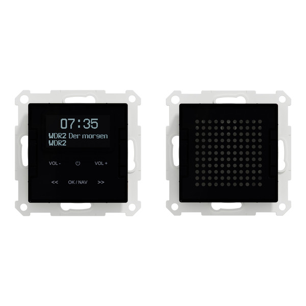 Für System M, das Set besteht aus einem Unterputz-Radio zum Empfang von DAB+, UKW, und zur Wiedergabe von Musik über Bluetooth, sowie einem Unterputz-Lautsprecher. Funktionen: Bedienung über Touchfeld, Musikwiedergabe über Bluetooth, Senderspeicher für 20 DAB+ und 20 UKW Sender, Zeit- und Datumsanzeige, Sleeptimer und 2 Wecktimer einstellbar, erweiterbar mit zweitem Lautsprecher. 230 V AC / 50 Hz, max. 6 W, Standby < 0,5 W, Schutzklasse: IP 20, Musikleistung: 2x 2 W RMS, (BxHxT): 70 x 70 x 43 mm, Einbautiefe: 29 mm, zu komplettieren mit einem 2fach-Rahmen im System M