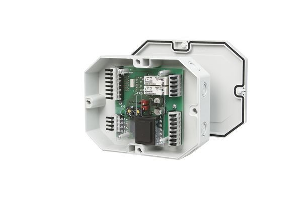 Das BACnet-MS/TP-Modul im IP65-Gehäuse mit 4 digitalen Eingängen und 2 Relaisausgängen mit Handbedienebene wurde für dezentrale Schaltaufgaben entwickelt. Geeignet um z. B. in einem Raum Lichtschalter und Fensterkontakte aufzunehmen und zwei Lichtbänder zu schalten oder als Jalousiesteuerung. Ebenfalls können 2 motorbetriebene Brandschutzklappen gesteuert werden. Hierbei sind die Relaiskontakte durch geeignete lastabhängige Maßnahmen zu schützen. Die Eingänge sind mit potentialfreien Kontakten zu beschalten. Über einen BACnet-Client können die Eingänge und Ausgänge über Standard-Objekte geschaltet und abgefragt werden. Die Einstellung der Moduladresse und der Bitrate erfolgt über zwei Drehschalter.