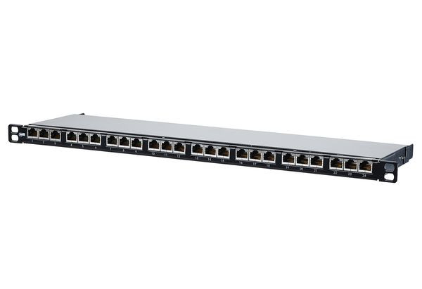 19 Zoll 0,5HE Träger aus schwarzem Metall, mit 24 einzelgeschirmten RJ45-Buchsen, Cat.6, A Komponentenprüfung nach ISO/IEC 11801, DIN EN 50173-1, ANSI/TIA-568.2-D und IEC 60603-7-51, GHMT zertifiziertEinhaltung der Klasse E, A bis 500 MHz nach ISO/IEC 11801, DIN EN 50173-1getestet: Komponente bis 600 MHz, Link bis 800 MHz, für 10 GBit Ethernet (IEEE 802.3an), Remote Powering (PoE, PoE plus, UPoE und 4PPoE) und HDBaseT geeignet, die Adernpaare können ohne Aufdrehen der Verseilung bis zur LSA-Schneidklemme geführt werden, Anschluss der 2- bis 4-paarigen Datenleitungen an LSA-Schneidklemmen (AWG 26/1-22/1). Mit Kennzeichnung der Adernfarben nach T568A, Zugentlastung und Schirmabgriff über zwei getrennte Kabelschellen