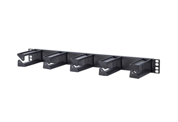 Rangierfeld 19 Zoll 1HE, Kabelmanagement zum horizontalen rangieren der Patchkabel, Kabelführungsbügel 100,0 mm, besonders geeignet auch für LWL-Patchkabel, 5 schwarze Kabelführungsbügel aus Kunststoff mit großen Auflageflächen, einfache Montage der Kabelführungsbügel durch verdrehen, optional erhältlich: aufsteckbare Beschriftungsleiste , Kabelführungsbügel nicht vormontiert , Varianten: Stahl pulverbeschichtet grau oder schwarz, gebürstetes Aluminium silber eloxiert, Edelstahl