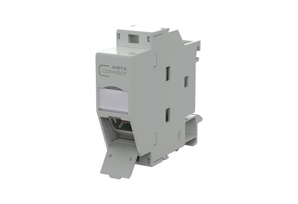 Anschlusseinheit zur Montage auf Tragschiene TH35 nach DIN EN 60715 in Elektroverteilern für Haus- und Industrieinstallation, neue METZ CONNECT FF Technologie, ohne Kunststofffolie verpackt (Easy Installation technology ? foil free) , bestückt mit einem E-DAT modul RJ45 K Einzelmodul, Kabelzugang 45° von oben, Steckrichtung 45° nach unten geneigt, Cat.6, A Komponentenprüfung nach ISO/IEC 11801, DIN EN 50173-1, ANSI/TIA-568.2-D und IEC 60603-7-51, GHMT zertifiziertEinhaltung der Klasse E, A nach ISO/IEC 11801, DIN EN 50173-1getestet: Link bis 500 MHz, für 10GBit Ethernet (IEEE 802.3an), Remote Powering (PoE, PoE plus, UPoE und 4PPoE) und HDBaseT, SAT-IP, AVoverIP geeignet, montagefreundlicher Anschluss der 2- bis 4-paarigen Datenleitung AWG 26/1 - 22/1 und Litzenleiter mit 7-drähtiger Cu-Litze AWG 26/7 - 22/7 an BTR 8fach IDC-Schneidklemmen, Kennzeichnung der Adernbelegung T568A und T568B, leichtes und schnelles Einlegen der Adernpaare in das E-DAT modul Ladestück, die Baubreite von 1TE ermöglicht den Einbau von bis zu 12 REGplus in Standard-Elektroverteiler, Bei Einbau als Gerät der Schutzklasse I erfolgt der Potentialausgleich über ein integriertes Potentialausgleichsblech direkt über die Tragschiene, welche über entsprechende Kontaktierungsklemmen am Gebäudepotentialausgleich anzuschließen ist.Das Modul ist durch eine Abdeckung vor direkter Berührung geschützt. Bei Montage in schutzisolierten Verteilern bleibt die Schutzklasse II somit bestehen. Hierfür muss die Potentialausgleichsfeder entfernt werden.integrierte Staubschutzklappe (auch farbig erhältlich)