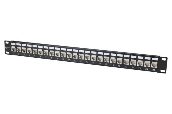 19 Zoll 1HE Modulträger mit 24 Einzelmodulen E-DAT modul K schwarz, GHMT Cat.6, A re-embedded zertifiziertCat.6, A Komponentenprüfung nach ISO/IEC 11801, DIN EN 50173-1, ANSI/TIA-568.2-D und IEC 60603-7-51, GHMT zertifiziertEinhaltung der Klasse E, A bis 500 MHz nach ISO/IEC 11801, DIN EN 50173-1getestet: Komponente bis 600 MHz, Link bis 800 MHz, für 10GBit Ethernet (IEEE 802.3an), Remote Powering (PoE, PoE plus, UPoE und 4PPoE) und HDBaseT, SAT-IP, AVoverIP geeignet, Anschluss von Datenleitungen AWG 26/1 - 22/1 (eindrähtig) und AWG 26/7 bis 22/7 (mehrdrähtig) an IDC-Schneidklemmen, Modulträgerfront aus pulverbeschichtetem Stahlblech, Modulhalter aus verzinktem Stahlblech, zusätzliche Zugentlastung am Modulträger mittels Kabelbinder möglich, Erdungsschraube mit Zahnscheibe, inkl. 40 cm Erdungskabel, alle vollgeschirmten Module sind über den Modulhalter verbunden