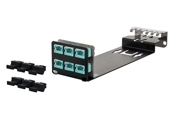 DCCS-Halterung mit 6 MPO/MTP-Kupplungen frontseitig montiert, MM-Kupplungen für Belegung ?aligned? (key up/ key up, Typ B) und ?opposed? (key up/key down, Typ A) verfügbar, SM-Kupplungen für Belegung ?opposed? (key up/key down, Typ A) verfügbar, Einfache Montage/Demontage in DCCS-Baugruppenträger (19 Zoll, 1 HE), Geeignet für den Einbau von MPO/MTP-Trunkkabeln in kundenspezifischen Längen, Gehäuse: Stahlblech schwarz pulverbeschichtet, Zugentlastung über beigelegte Halterung, Varianten: grün (SM), lindgrün (OM5), violett (OM4), aqua (OM3), Belegung Typ A, Belegung Typ B, alle verfügbaren Varianten können über den Konfigurator erstellt werden