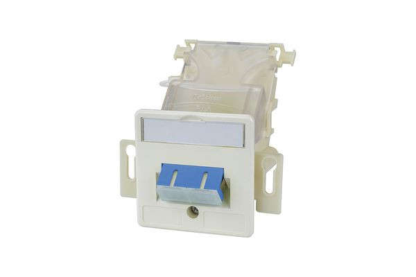 Glasfaser-Anschlusseinheit für Brüstungskanal mit Kupplung, bestückt mit 1xLC-Q, 1xSC-D, 1xST-D Kupplung, Auslassrichtung 45º nach unten geneigt, für LWL-Kupplungen mit Flanschbefestigung (keine Clips), belastungsfreie, geschützte Platzierung der LWL-Stecker im Kanalinnenbereich, Zugentlastung mit Kabelbinder, Zentralstück 50 x 50 mm nach DIN 41075 Teil1:1989, Sichtfenster für beiliegende Beschriftungseinlage, Einhaltung der Biegeradien >20 mm für LWL-Kabel in Verbindung mit Montagehalter, geeignet für vorkonfektioniertes Kabel bzw. Stecker-Vor-Ort-Konfektionierung, Standardfarbe reinweiß RAL 9010, Varianten: 1xLC-Q, 1xSC-D, 1xST-D