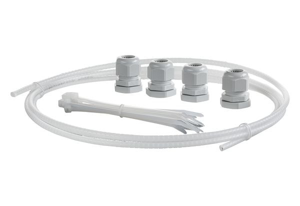 Set zur Montage von 4 Kompaktmodulen OpDAT CM an ein Bündeladerkabel mit 1x12 Fasern mit einem Bündeladerdurchmesser von max. 2,8 mm, Lieferumfang: vier PG-Verschraubungen für Kabel bis zu 14 mm, Schutzschlauch für bis zu 4 Kompaktmodule