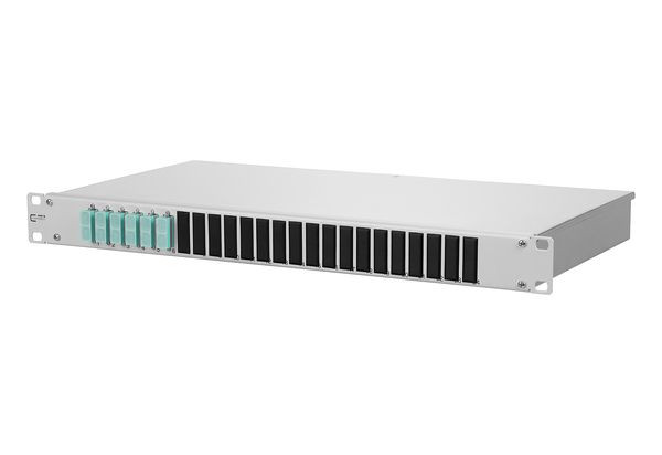 19 Zoll, 1HE LWL-Patchfeld für Festeinbau, bestückt mit SC-D-Kupplungen, vorbereitet für den Einbau von vorkonfektionierten Installationskabeln (OpDAT VIK), leichte Aluminium-Konstruktion mit Stahlblech Frontplatte (grau oder schwarz), nicht belegte Ausbrüche mit Blindstopfen verschlossen, abnehmbare Frontplatte zur einfachen Kupplungsmontage, servicefreundliche, verschraubte Abdeckung, mehrere Kabeleingangsmöglichkeiten rückseitig (Befestigung mit PG13,5, PG16 und PG21 bzw. M20 und M25), werkzeuglose Befestigung von vorkonfektionierten Installationskabeln (OpDAT VIK) in einem U-Ausschnitt, Varianten: bestückt mit 6, 12 oder 24 SC-D Kupplungen jeweils blau (OS2), lindgrün (OM5), violett (OM4), aqua (OM3) oder 6, 12 oder 24 SC-D APC Kupplungen jeweils grün (OS2)