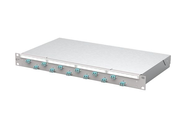 19 Zoll, 1HE Patchfeld zum Festeinbau, Bestückt mit 12xLC-D Kupplungen, Versetzte Kupplungsanordnung für ein einfaches Handling, Frontplatte mit Beschriftungsfeld, Frontplatte pulverbeschichtet in grau RAL 7035, Werkzeugloses Öffnen des Deckels, Mehrere Kabeleingangsmöglichkeiten rückseitig: 6xM20; 2xM25; 2xVIK-Einbauausschnitte, Vorbereitet für den Einbau von vorkonfektionierten Leitungen