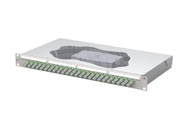 19 Zoll, 1HE Patchfeld zum Festeinbau, Bestückt mit 24xSC-D Kupplungen und 48xSC APC OS2 Pigtails, Kupplungsanordnung schräg, Pigtails in Standardspleißkassette mit Crimpspleißhaltern eingelegt und abgesetzt, Pigtail visuell geprüft und in Kupplungen eingesteckt, Farbcodierung nach IEC 60304, Frontplatte mit Beschriftungsfeld, Frontplatte pulverbeschichtet in grau RAL 7035, Werkzeugloses Öffnen des Deckels, Mehrere Kabeleingangsmöglichkeiten rückseitig: 6xM20; 2xM25; 2xVIK-Einbauausschnitte