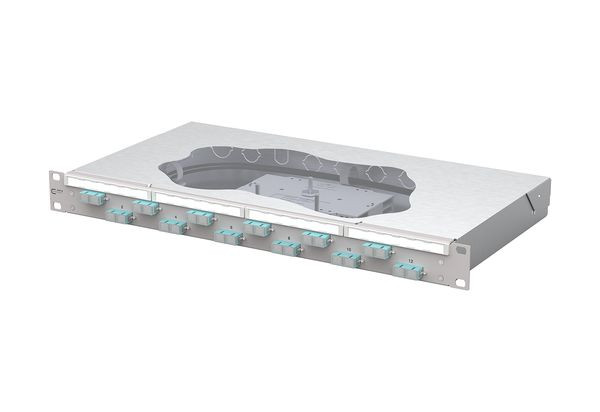 19 Zoll, 1HE Patchfeld zum Festeinbau, Bestückt mit 12xSC-D Kupplungen und 24xSC-D OM3 Pigtails, Versetzte Kupplungsanordnung für ein einfaches Handling, Pigtails in Standardspleißkassette mit Crimpspleißhaltern eingelegt und abgesetzt, Pigtail visuell geprüft und in Kupplungen eingesteckt, Farbcodierung nach IEC 60304, Frontplatte mit Beschriftungsfeld, Frontplatte pulverbeschichtet in grau RAL 7035, Werkzeugloses Öffnen des Deckels, Mehrere Kabeleingangsmöglichkeiten rückseitig: 6xM20; 2xM25; 2xVIK-Einbauausschnitte