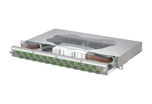19 Zoll, 1HE Patchfeld mit ausziehbarer Schublade, Bestückt mit 24xLC-D Kupplungen und 48xLC APC OS2 Pigtails, Versetzte Kupplungsanordnung für ein einfaches Handling, Pigtails in Standardspleißkassette mit Crimpspleißhaltern eingelegt und abgesetzt, Pigtail visuell geprüft und in Kupplungen eingesteckt, Farbcodierung nach IEC 60304, Werkzeugloser Metall-Bajonettverschluss zum Verriegeln der Schublade, Auszug zur besseren Montage abkippbar und komplett herausnehmbar (Auszugsstop), 30 mm tiefenverstellbar, Frontplatte mit Beschriftungsfeld, Frontplatte pulverbeschichtet in grau RAL 7035, Mehrere Kabeleingangsmöglichkeiten rückseitig: 6xM20; 2xM25; 2xVIK-Einbauausschnitte