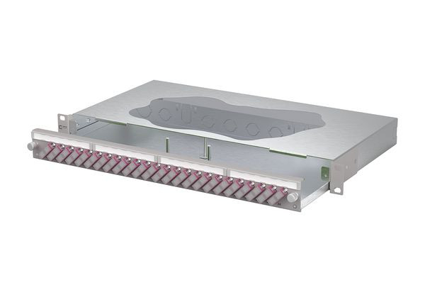 19 Zoll, 1HE Patchfeld mit ausziehbarer Schublade, Bestückt mit 24xSC-D Kupplungen, Kupplungsanordnung schräg, Werkzeugloser Metall-Bajonettverschluss zum Verriegeln der Schublade, Auszug zur besseren Montage abkippbar und komplett herausnehmbar (Auszugsstop), 30 mm tiefenverstellbar, Frontplatte mit Beschriftungsfeld, Frontplatte pulverbeschichtet in grau RAL 7035, Mehrere Kabeleingangsmöglichkeiten rückseitig: 6xM20; 2xM25; 2xVIK-Einbauausschnitte, Vorbereitet für den Einbau von vorkonfektionierten Leitungen