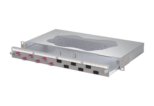 19 Zoll, 1HE Patchfeld mit ausziehbarer Schublade, Bestückt mit 6xLC-D Kupplungen, Versetzte Kupplungsanordnung für ein einfaches Handling, Werkzeugloser Metall-Bajonettverschluss zum Verriegeln der Schublade, Auszug zur besseren Montage abkippbar und komplett herausnehmbar (Auszugsstop), 30 mm tiefenverstellbar, Frontplatte mit Beschriftungsfeld, Frontplatte pulverbeschichtet in grau RAL 7035, Mehrere Kabeleingangsmöglichkeiten rückseitig: 6xM20; 2xM25; 2xVIK-Einbauausschnitte, Vorbereitet für den Einbau von vorkonfektionierten Leitungen