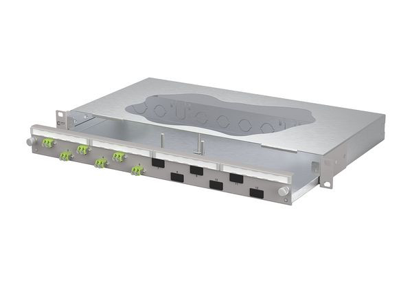 19 Zoll, 1HE Patchfeld mit ausziehbarer Schublade, Bestückt mit 6xLC-D Kupplungen, Versetzte Kupplungsanordnung für ein einfaches Handling, Werkzeugloser Metall-Bajonettverschluss zum Verriegeln der Schublade, Auszug zur besseren Montage abkippbar und komplett herausnehmbar (Auszugsstop), 30 mm tiefenverstellbar, Frontplatte mit Beschriftungsfeld, Frontplatte pulverbeschichtet in grau RAL 7035, Mehrere Kabeleingangsmöglichkeiten rückseitig: 6xM20; 2xM25; 2xVIK-Einbauausschnitte, Vorbereitet für den Einbau von vorkonfektionierten Leitungen