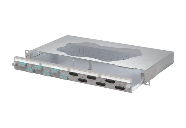 19 Zoll, 1HE Patchfeld mit ausziehbarer Schublade, Bestückt mit 6xSC-D Kupplungen, Versetzte Kupplungsanordnung für ein einfaches Handling, Werkzeugloser Metall-Bajonettverschluss zum Verriegeln der Schublade, Auszug zur besseren Montage abkippbar und komplett herausnehmbar (Auszugsstop), 30 mm tiefenverstellbar, Frontplatte mit Beschriftungsfeld, Frontplatte pulverbeschichtet in grau RAL 7035, Mehrere Kabeleingangsmöglichkeiten rückseitig: 6xM20; 2xM25; 2xVIK-Einbauausschnitte, Vorbereitet für den Einbau von vorkonfektionierten Leitungen