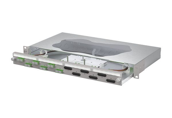 19 Zoll, 1HE Patchfeld mit ausziehbarer Schublade, Bestückt mit 6xSC-D Kupplungen und 12xSC APC OS2 Pigtails, Versetzte Kupplungsanordnung für ein einfaches Handling, Pigtails in Standardspleißkassette mit Crimpspleißhaltern eingelegt und abgesetzt, Pigtail visuell geprüft und in Kupplungen eingesteckt, Farbcodierung nach IEC 60304, Werkzeugloser Metall-Bajonettverschluss zum Verriegeln der Schublade, Auszug zur besseren Montage abkippbar und komplett herausnehmbar (Auszugsstop), 30 mm tiefenverstellbar, Frontplatte mit Beschriftungsfeld, Frontplatte pulverbeschichtet in grau RAL 7035, Mehrere Kabeleingangsmöglichkeiten rückseitig: 6xM20; 2xM25; 2xVIK-Einbauausschnitte