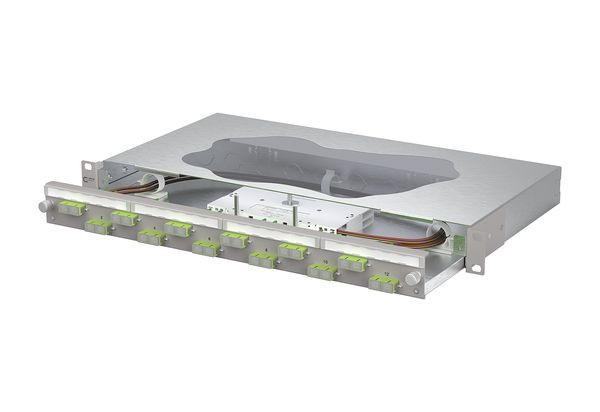 19 Zoll, 1HE Patchfeld mit ausziehbarer Schublade, Bestückt mit 12xSC-D Kupplungen und 24xSC OM5 Pigtails, Versetzte Kupplungsanordnung für ein einfaches Handling, Pigtails in Standardspleißkassette mit Crimpspleißhaltern eingelegt und abgesetzt, Pigtail visuell geprüft und in Kupplungen eingesteckt, Farbcodierung nach IEC 60304, Werkzeugloser Metall-Bajonettverschluss zum Verriegeln der Schublade, Auszug zur besseren Montage abkippbar und komplett herausnehmbar (Auszugsstop), 30 mm tiefenverstellbar, Frontplatte mit Beschriftungsfeld, Frontplatte pulverbeschichtet in grau RAL 7035, Mehrere Kabeleingangsmöglichkeiten rückseitig: 6xM20; 2xM25; 2xVIK-Einbauausschnitte