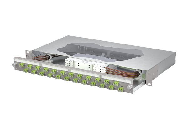 19 Zoll, 1HE Patchfeld mit ausziehbarer Schublade, Bestückt mit 24xLC-D Kupplungen und 48xLC OM5 Pigtails, Versetzte Kupplungsanordnung für ein einfaches Handling, Pigtails in Standardspleißkassette mit Crimpspleißhaltern eingelegt und abgesetzt, Pigtail visuell geprüft und in Kupplungen eingesteckt, Farbcodierung nach IEC 60304, Werkzeugloser Metall-Bajonettverschluss zum Verriegeln der Schublade, Auszug zur besseren Montage abkippbar und komplett herausnehmbar (Auszugsstop), 30 mm tiefenverstellbar, Frontplatte mit Beschriftungsfeld, Frontplatte pulverbeschichtet in grau RAL 7035, Mehrere Kabeleingangsmöglichkeiten rückseitig: 6xM20; 2xM25; 2xVIK-Einbauausschnitte