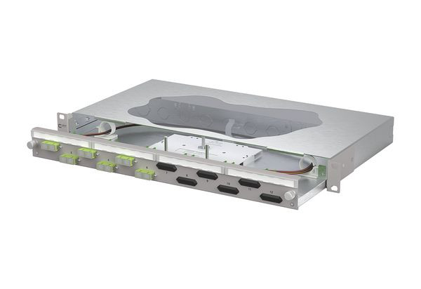 19 Zoll, 1HE Patchfeld mit ausziehbarer Schublade, Bestückt mit 6xSC-D Kupplungen und 12xSC OM5 Pigtails, Versetzte Kupplungsanordnung für ein einfaches Handling, Pigtails in Standardspleißkassette mit Crimpspleißhaltern eingelegt und abgesetzt, Pigtail visuell geprüft und in Kupplungen eingesteckt, Farbcodierung nach IEC 60304, Werkzeugloser Metall-Bajonettverschluss zum Verriegeln der Schublade, Auszug zur besseren Montage abkippbar und komplett herausnehmbar (Auszugsstop), 30 mm tiefenverstellbar, Frontplatte mit Beschriftungsfeld, Frontplatte pulverbeschichtet in grau RAL 7035, Mehrere Kabeleingangsmöglichkeiten rückseitig: 6xM20; 2xM25; 2xVIK-Einbauausschnitte